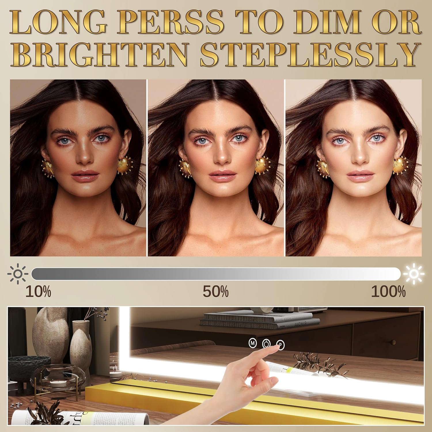 - 【3 Light Modes & Smart Dimming】 Switch between warm light, natural daylight, and cool white light to match any scenario—morning routines, evening events, or studio-style makeup. Adjust brightness with a simple touch to achieve flawless lighting for every look. Whether you're contouring, applying eyeliner, or checking skincare, the dimmable feature ensures optimal visibility.