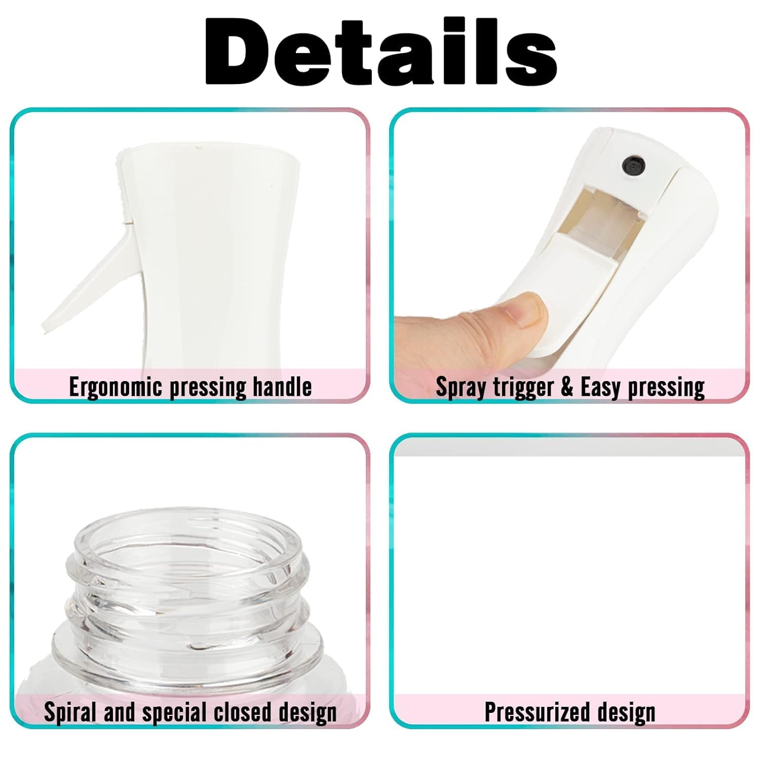 - High Quality: The continuous mist spray bottle is made of quality PET material with advanced technology, strong and not easily dented, durable and refillable. BPA-free, no smell, no leakage, and refillable. If anything goes wrong with your continuous spray bottle, please contact us directly.