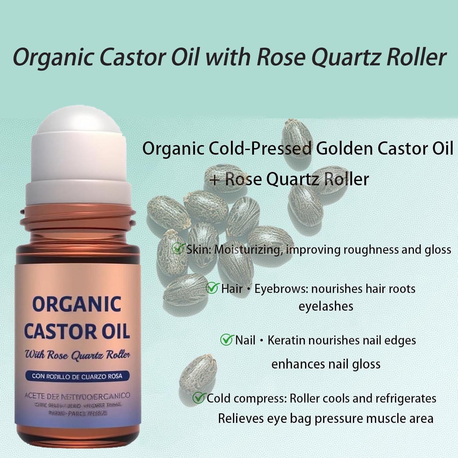 Organic Castor Oil Roll-On with Rose Quartz Roller, 1.7 fl oz – 100% Pure & Cold-Pressed, Hexane-Free, Extra Virgin Golden Oil for Skin, Brows, Lashes & Mess-Free Castor Packs