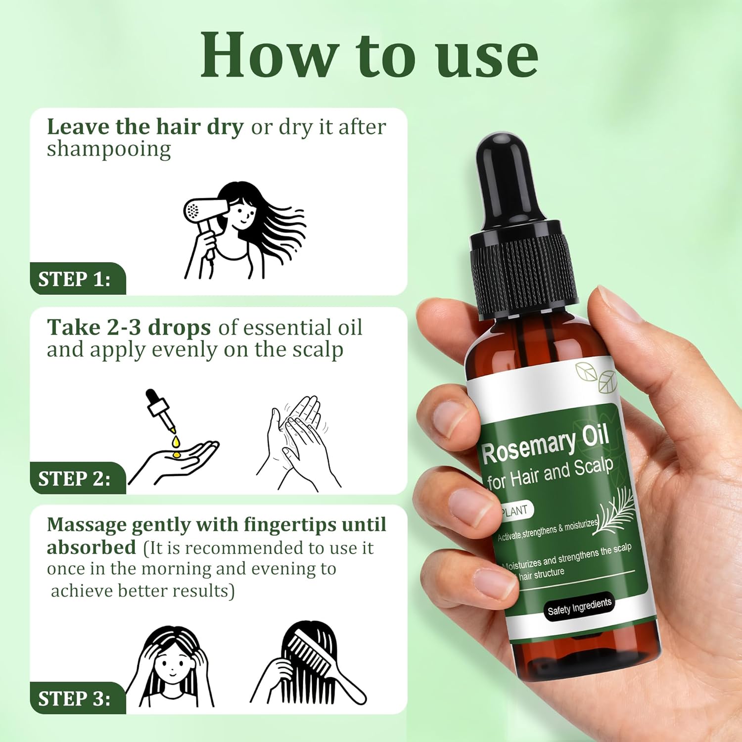 - 【Safe & Easy to Use】Formulated with safety in mind, the rosemary oil features quality ingredients like Coconut and Sesame Seed Oil.For best results, apply 2-3 drops to a dry or towel-dried scalp, massage gently until absorbed. Use morning and night.The dropper design allows for precise control of dosage and convenient use.